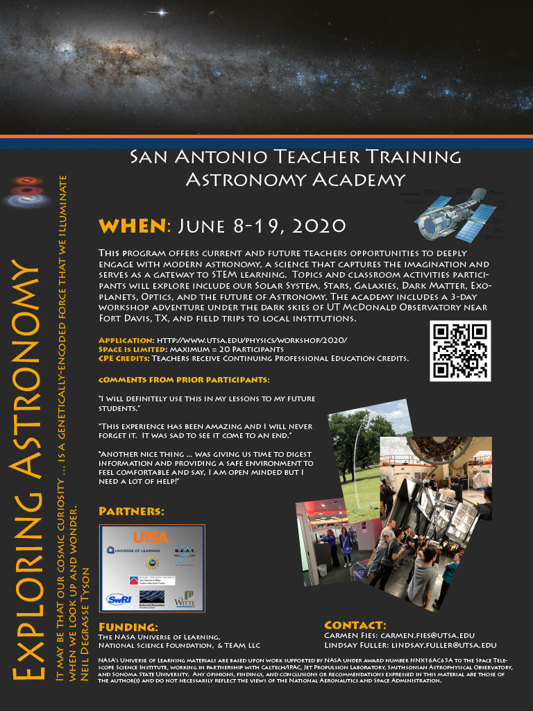 It is the decision of UTSA to move all functions during summer 2020 to an online forum. Due to the interactive, hands-on nature of our summer workshop, we regretfully find that it is in the best interest of our participants to postpone our summer workshop until our next scheduled workshop in summer 2021. If you would like some ideas for classroom activities involving astronomy for the 2020-2021 school year, or if you have any questions, please contact Lindsay Fuller, Chris Packham, or Carmen Fies.
