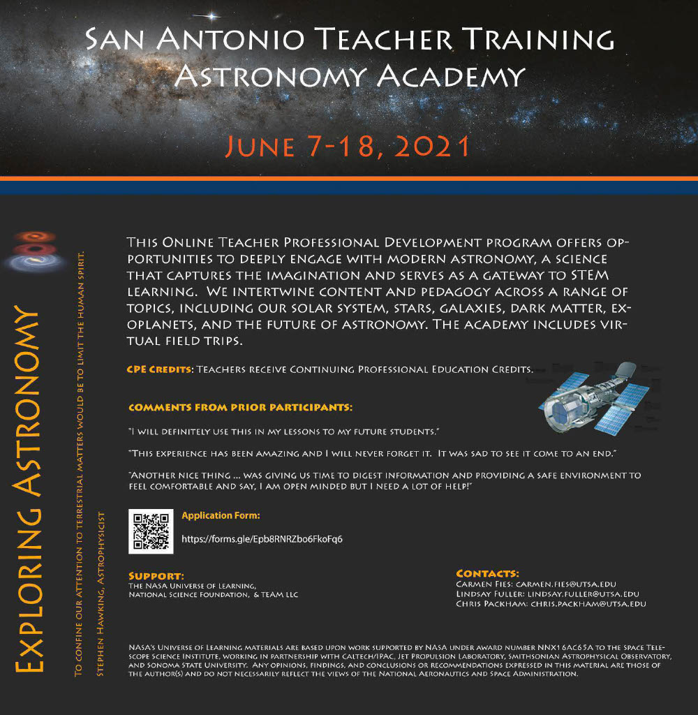 This online Teacher Professional Development program offers opportunities to deeply engage with modern astronomy, a science that captures the imagination and serves as a gateway to STEM learning. We intertwine content and pedagogy across a range of topics, including our solar system, stars, galaxies, dark matter, exoplanets, and the future of astronomy. The academy includes virtual field trips.